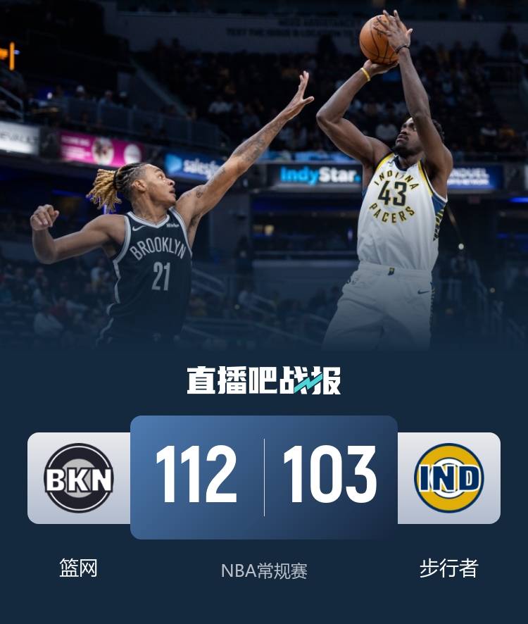 11月6日讯 NBA常规赛,步行者主场迎战篮网。步行者目前1胜6负,篮网则是7连败未尝胜绩。