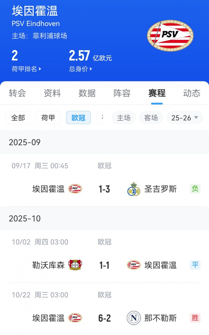 欧冠第二轮,埃因霍温还曾客场与勒沃库森1-1战平,至今三轮的表现可谓“劫富济贫”。