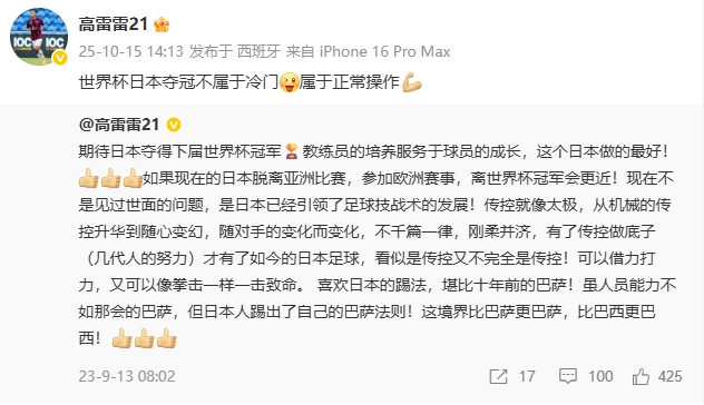 高雷雷转发了自己两年前谈日本足球的言论,并写道:“世界杯日本夺冠不属于冷门,属于正常操作”