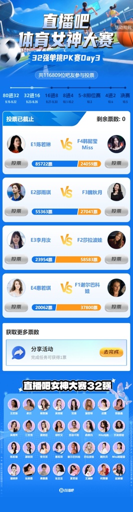 2025年『体育女神大赛』已进入32强单挑PK赛阶段,淘汰赛Day3(E组、F组)结果如下: